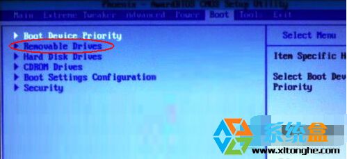 6、接下来按ESC取消键,返回上低级设置界面,按上下方向键,选中第二行的“Removeable Drives”项,并按回车进入: