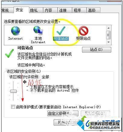 3、回到internet选项窗口,切换到“安全”选项卡,打开“可信任站点”,把“该区域的安全级别”设置到最低最低,然后点击确定,退出浏览器;